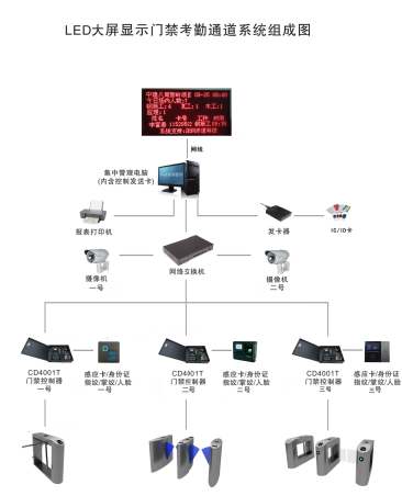 主要由计算机/打印机、智能读卡器、智能控制器、摄像机、视频服务器、智能闸机、智能卡及管理软件等组成。采用TCP/IP网络结构通讯,通讯距离可无限扩展,单台计算机可接任意数量智能闸机。智能闸机,既可联网运行,又可脱机运行。系统组成图如下: